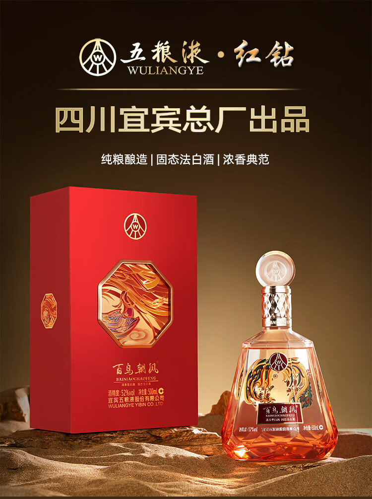 平台首页 > 酒茶文化 > 五粮液股份 百鸟朝凤红钻 浓香型白酒礼盒 52度500ml*2瓶礼盒装 宴请酒